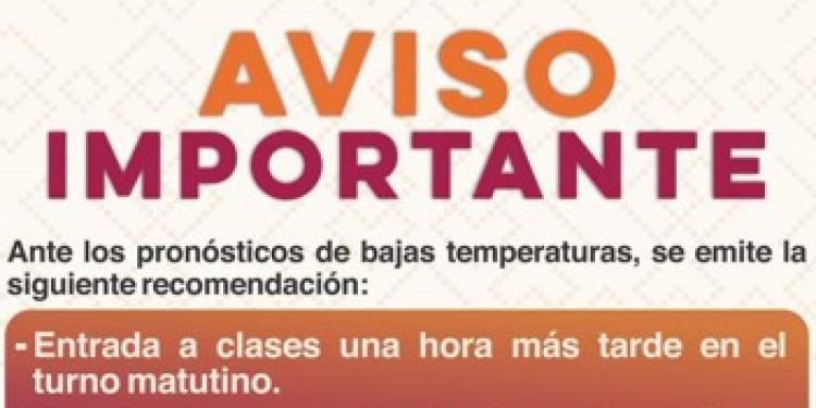 El funcionario estatal hizo un llamado a enviar bien abrigados a los estudiantes para cuidar su salud y exhortó a la sociedad en general a permanecer atenta a cualquier aviso que emitan las autoridades correspondientes a través de los medios oficiales de información.