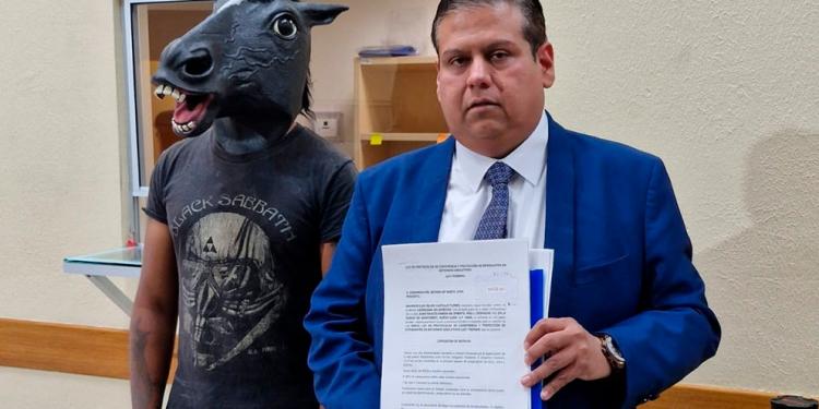 Frente a los medios de comunicación, el hombre, que usaba una máscara de caballo, arrancó plantas de un área verde del exterior del recinto para simular comérselas y aparentaba relinchar cuando los reporteros le preguntaban cómo hace un caballo.