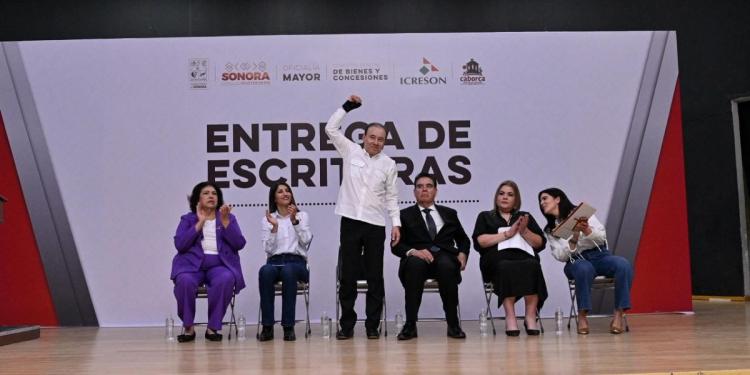 Durante su gira de trabajo, en la que también encabezó en Caborca la conmemoración del 169 aniversario de la Gesta Heroica, el mandatario estatal entregó 600 escrituras de lotes habitacionales a familias de las colonias Palo Verde, Juan Chait I y Juan Chait II, brindando certeza jurídica y patrimonial a quienes durante años esperaron este documento que les da seguridad y tranquilidad sobre su patrimonio.