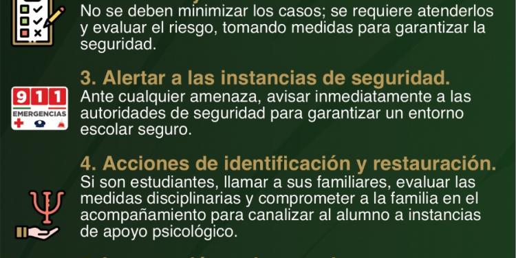 Ante esta situación, invitó a colaborar en la estrategia para evitar la difusión de amenazas, “bromas” o mensajes que generen temor, incluidos retos virales o publicaciones sin verificar relacionadas con posibles hechos violentos en planteles escolares.